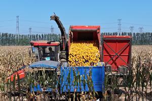 (251021) -- TIANJIN, 21 octubre, 2025 (Xinhua) -- Vista aérea tomada con un dron el 21 de octubre de 2025 de una segadora cosechando soja, en el municipio de Xiawotou del distrito de Jizhou, en Tianjin, en el norte de China. (Xinhua/Li Ran) (oa) (ah) (ce)