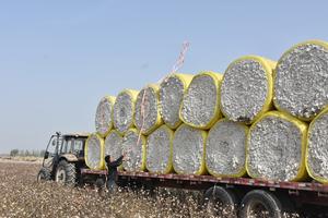 (251021) — AKSU, 21 octubre, 2025 (Xinhua) — Un aldeano carga fardos de algodón recién cosechado en un campo, en el distrito de Xayar de Aksu, en la región autónoma uygur de Xinjiang, en el noroeste de China, el 21 de octubre de 2025. La temporada de cosecha de algodón ha comenzado en el distrito de Xayar. (Xinhua/Gu Yu) (jg) (ra) (ce)