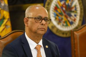 (251020) — QUITO, 20 octubre, 2025 (Xinhua) — El secretario general de la Organización de Estados Americanos (OEA), Albert Ramdin, asiste a la firma del Memorando de Entendimiento para la Cooperación Técnica en materia de seguridad multidimensional en Ecuador, en la ciudad de Quito, capital de Ecuador, el 20 de octubre de 2025. Ramdin firmó el lunes un acuerdo de cooperación técnica en seguridad con Ecuador durante su primera visita oficial al país sudamericano, en la que se reunió con el presidente, Daniel Noboa, y autoridades del Gobierno, informó el Ministerio de Relaciones Exteriores y Movilidad Humana. (Xinhua/Ricardo Landeta) (rl) (rtg) (ah) (ce)