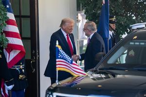 (251020) -- WASHINGTON, 20 octubre, 2025 (Xinhua) -- El presidente estadounidense, Donald Trump (i), da la bienvenida al primer ministro australiano, Anthony Albanese, en la Casa Blanca, en Washington D. C., Estados Unidos, el 20 de octubre de 2025. (Xinhua/Hu Yousong) (rtg) (ah) (ce)