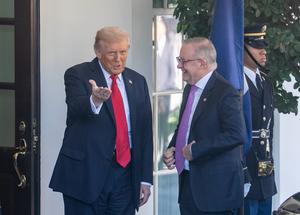 (251020) -- WASHINGTON, 20 octubre, 2025 (Xinhua) -- El presidente estadounidense, Donald Trump (i), da la bienvenida al primer ministro australiano, Anthony Albanese, en la Casa Blanca, en Washington D. C., Estados Unidos, el 20 de octubre de 2025. (Xinhua/Hu Yousong) (rtg) (ah) (ce)