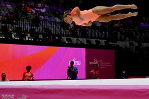 (251021) -- YAKARTA, 21 octubre, 2025 (Xinhua) -- Flavia Saraiva, de Brasil, compite durante la clasificación femenina de Ejercicios de Suelo, en el 53 Campeonato Mundial de Gimnasia Artística de la FIG, en Yakarta, Indonesia, el 21 de octubre de 2025. (Xinhua/Agung Kuncahya B.) (oa) (ah) (ce)