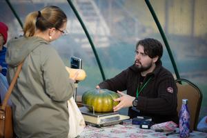 (251020) — VARSOVIA, 20 octubre, 2025 (Xinhua) — Imagen del 19 de octubre de 2025 de un empleado pesando una calabaza para una cliente durante el anual Festival de las Calabazas, en Varsovia, Polonia. Polonia es uno de los principales productores de calabazas en Europa. (Xinhua/Jaap Arriens) (rtg) (ah) (ce)
