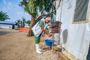 (251020) — BULAPE, 20 octubre, 2025 (Xinhua) — Imagen del 17 de octubre de 2025 de una trabajadora de la salud lavándose las manos en un centro de tratamiento del ébola en la zona sanitaria de Bulape, República Democrática del Congo (RDC). La Organización Mundial de la Salud (OMS) afirmó el domingo que las autoridades sanitarias podrían declarar el fin del actual brote de ébola en RDC a principios de diciembre si no se detectan nuevos casos antes de esa fecha. (Xinhua/OMS) (oa) (ah) (ce)