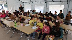 (251020) — SALMA, 20 octubre, 2025 (Xinhua) — Imagen del 13 de octubre de 2025 de niños tomando una clase en un centro de aprendizaje temporal, en Salma, en la provincia de Latakia, Siria. Ubicadas entre olivares y los esqueletos de los edificios destruidos, las tiendas blancas que sirven de escuelas ofrecen poco refugio del frío aire de la montaña. En el interior, mesas de plástico sustituyen a los pupitres de madera, pero el rasgueo de los lápices sobre el papel resuena como el latido de un pueblo que lentamente vuelve a la vida. (Xinhua/Str) (oa) (ah) (ce)