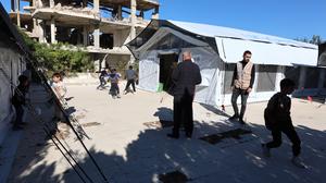 (251020) — SALMA, 20 octubre, 2025 (Xinhua) — Imagen del 13 de octubre de 2025 de niños jugando en un centro de aprendizaje temporal, en Salma, en la provincia de Latakia, Siria. Ubicadas entre olivares y los esqueletos de los edificios destruidos, las tiendas blancas que sirven de escuelas ofrecen poco refugio del frío aire de la montaña. En el interior, mesas de plástico sustituyen a los pupitres de madera, pero el rasgueo de los lápices sobre el papel resuena como el latido de un pueblo que lentamente vuelve a la vida. (Xinhua/Str) (oa) (ah) (ce)