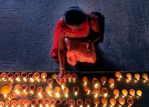 (251020) -- COLOMBO, 20 octubre, 2025 (Xinhua) -- Una mujer enciende lámparas de aceite para festejar el Diwali, o el Festival Hindú de las luces, en un templo, en Colombo, Sri Lanka, el 20 de octubre de 2025. (Xinhua/Ajith Perera) (rtg) (ah) (ce)