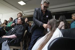 (251020) -- MONTEVIDEO, 20 octubre, 2025 (Xinhua) -- Un peluquero realiza un corte de cabello a una niña durante una jornada de donación de cabello a beneficio de la confección de accesorios y pelucas para mujeres en tratamiento oncológico en ocasión del Día Mundial de Lucha contra el Cáncer de Mama, en Montevideo, capital de Uruguay, el 20 de octubre de 2025. (Xinhua/Nicolás Celaya) (nc) (oa) (ah) (ce)