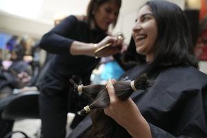 (251020) -- MONTEVIDEO, 20 octubre, 2025 (Xinhua) -- Una peluquera realiza un corte de cabello a una mujer durante una jornada de donación de cabello a beneficio de la confección de accesorios y pelucas para mujeres en tratamiento oncológico en ocasión del Día Mundial de Lucha contra el Cáncer de Mama, en Montevideo, capital de Uruguay, el 20 de octubre de 2025. (Xinhua/Nicolás Celaya) (nc) (oa) (ah) (ce)