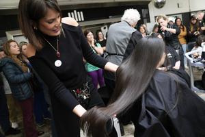 (251020) -- MONTEVIDEO, 20 octubre, 2025 (Xinhua) -- Una peluquera muestra el cabello de una mujer previo a cortarlo durante una jornada de donación de cabello a beneficio de la confección de accesorios y pelucas para mujeres en tratamiento oncológico en ocasión del Día Mundial de Lucha contra el Cáncer de Mama, en Montevideo, capital de Uruguay, el 20 de octubre de 2025. (Xinhua/Nicolás Celaya) (nc) (oa) (ah) (ce)