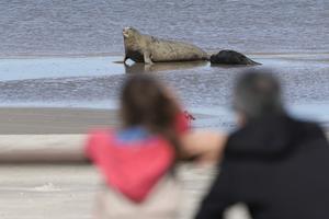 (251021) — PIRIAPOLIS, 21 octubre, 2025 (Xinhua) — Una niña y su padre observan a una elefanta marina mientras descansa junto a su cría en una playa, en Piriápolis, en el departamento de Maldonado, Uruguay, el 21 de octubre de 2025. (Xinhua/Nicolás Celaya) (nc) (oa) (ah) (ce)