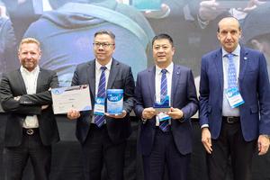 (251022) -- SANTIAGO, 22 octubre, 2025 (Xinhua) -- Imagen del 21 de octubre de 2025 de representes de la empresa china de lácteos Yili recibiendo un reconocimiento durante la Cumbre Mundial de la Federación Internacional de la Leche (IDF, por sus siglas en inglés), en Santiago, capital de Chile. Yili, la mayor empresa china de productos lácteos, obtuvo el martes dos reconocimientos a la innovación y prácticas sostenibles en Chile durante la Cumbre Mundial de la IDF, realizada esta semana por primera vez en un país de América del Sur. (Xinhua/Meng Dingbo) (jg) (da) (ce)