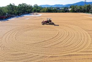 (251022) -- BEIJING, 22 octubre, 2025 (Xinhua) -- Imagen tomada con un dron el 22 de octubre de 2025 de un agricultor operando maquinaria agrícola para secar maíz en una granja, en la ciudad de Lianyungang, en la provincia de Jiangsu, en el este de China. (Xinhua/Wang Jianmin) (jg) (da) (ce)