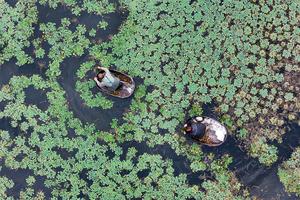 (251022) — BEIJING, 22 octubre, 2025 (Xinhua) — Vista aérea tomada con un dron el 22 de octubre de 2025 de agricultores cosechando castañas de agua, en la aldea de Quanxin del poblado de Donglin en el distrito de Wuxing en la ciudad de Huzhou, en la provincia de Zhejiang, en el este de China. (Xinhua/He Weiwei) (jg) (da) (ce)