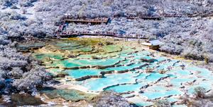 (251022) -- ABA, 22 octubre, 2025 (Xinhua) -- Vista aérea tomada con un dron el 21 de octubre de 2025 de un colorido conjunto de estanques después de la nevada en el área escénica de Huanglong, en la prefectura autónoma tibetana y qiang de Aba, en la provincia de Sichuan, en el suroeste de China. Huanglong fue testigo de la primera nevada de este otoño el martes. (Xinhua/Sun Jiapeng) (jg) (da) (ce)