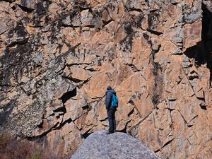 (251022) — CHENGDU, 22 octubre, 2025 (Xinhua) — Imagen del 21 de octubre de 2025 de Chen Xuesong, un conservador del patrimonio cultural, revisando pinturas rupestres, en la prefectura autónoma tibetana de Garze, en la provincia de Sichuan, en el suroeste de China. Este grupo de pinturas rupestres en la prefectura data de hace unos 8.000 años. (Xinhua/Xue Chen) (ah) (ra) (ce)