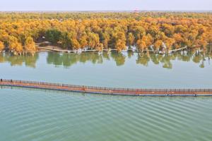 (251022) — XAYAR, 22 octubre, 2025 (Xinhua) — Vista aérea tomada con un dron el 22 de octubre de 2025 del paisaje otoñal del bosque de álamos del desierto (populus euphratica), en el distrito de Xayar, en la región autónoma uygur de Xinjiang, en el noroeste de China. (Xinhua/Gu Yu) (ah) (ra) (ce)