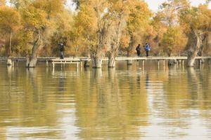 (251022) -- XAYAR, 22 octubre, 2025 (Xinhua) -- Turistas disfrutan del paisaje otoñal del bosque de álamos del desierto (populus euphratica), en el distrito de Xayar, en la región autónoma uygur de Xinjiang, en el noroeste de China, el 22 de octubre de 2025. (Xinhua/He Xiaotong) (ah) (ra) (ce)