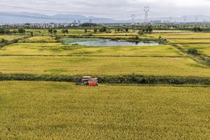 (251022) -- JINHUA, 22 octubre, 2025 (Xinhua) -- Vista aérea tomada con un dron el 22 de octubre de 2025 de una segadora cosechando arroz con cáscara en una zona de demostración de tierras agrícolas de alta calidad, en el poblado de Tangya del distrito de Jindong, en la ciudad de Jinhua, en la provincia de Zhejiang, en el este de China. (Xinhua/Xu Yu) (ah) (ra) (ce)