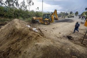 (251022) -- PICHINCHA, 22 octubre, 2025 (Xinhua) -- Maquinaria pesada retira un montículo de tierra tras el anuncio del fin de las movilizaciones por parte de la Confederación de Nacionalidades Indígenas de Ecuador (Conaie), en la comunidad de Tupigachi, en la provincia de Pichincha, Ecuador, el 22 de octubre de 2025. La Conaie anunció el miércoles el fin del paro nacional indefinido que encabezó desde el pasado 22 de septiembre en el país en rechazo a la eliminación del subsidio al diésel, decretada por el Gobierno. (Xinhua/Ricardo Landeta) (rl) (jg) (da) (ce)