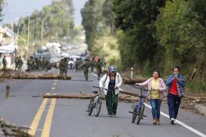 (251022) -- PICHINCHA, 22 octubre, 2025 (Xinhua) -- Mujeres son vistas después de que militares y elementos de la policía abrieron la circulación en la vía Tabacundo-Cajas tras el anuncio del fin de las movilizaciones por parte de la Confederación de Nacionalidades Indígenas de Ecuador (Conaie), en la comunidad de Tupigachi, en la provincia de Pichincha, Ecuador, el 22 de octubre de 2025. La Conaie anunció el miércoles el fin del paro nacional indefinido que encabezó desde el pasado 22 de septiembre en el país en rechazo a la eliminación del subsidio al diésel, decretada por el Gobierno. (Xinhua/Ricardo Landeta) (rl) (jg) (da) (ce)
