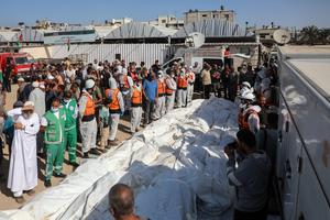 (251022) -- GAZA, 22 octubre, 2025 (Xinhua) -- Médicos palestinos preparan los cuerpos de víctimas no identificadas, que fueron entregados por Israel a través del Comité Internacional de la Cruz Roja, en el Complejo Médico Nasser, en la ciudad de Khan Younis, en el sur de la Franja de Gaza, el 22 de octubre de 2025. (Xinhua/Rizek Abdeljawad) (ah) (ra) (ce)