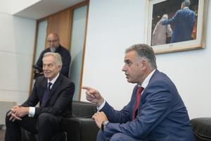 (251022) -- MONTEVIDEO, 22 octubre, 2025 (Xinhua) -- El presidente uruguayo, Yamandú Orsi (d), se reúne con el ex primer ministro británico y presidente del "Tony Blair Institute for Global Change", Tony Blair (i), en la Torre Ejecutiva, en Montevideo, capital de Uruguay, el 22 de octubre de 2025. (Xinhua/Nicolás Celaya) (nc) (jg) (da) (ce)