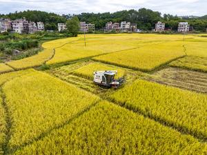 (251023) -- BEIJING, 23 octubre, 2025 (Xinhua) -- Vista aérea tomada con un dron del 23 de octubre de 2025 de una segadora cosechando arroz, en Wuzhou, en la region autónoma de la etnia zhuang de Guangxi, en el sur de China. El jueves se conmemora el Descenso de las Heladas. Como último término solar del otoño, el Descenso de las Heladas anuncia la llegada del invierno. (Xinhua/He Huawen) (da) (ra) (ce)