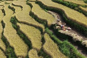 (251023) -- BEIJING, 23 octubre, 2025 (Xinhua) -- Vista aérea tomada con un dron del 23 de octubre de 2025 de agricultores cosechando arroz, en Tengchong, en la provincia de Yunnan, en el suroeste de China. El jueves se conmemora el Descenso de las Heladas. Como último término solar del otoño, el Descenso de las Heladas anuncia la llegada del invierno. (Xinhua/Gong Zujin) (da) (ra) (ce)