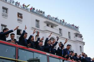 (251023) -- RABAT, 23 octubre, 2025 (Xinhua) -- Imagen del 22 de octubre de 2025 de jugadores del equipo de fútbol Sub-20 de Marruecos festejando durante un desfile para celebrar su victoria en la Copa Mundial Sub-20, en Rabat, Marruecos. (Xinhua/Huo Jing) (rtg) (ra) (ce)