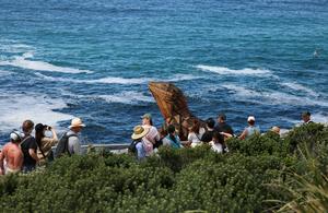 (251024) -- SIDNEY, 24 octubre, 2025 (Xinhua) -- Visitantes observan una pieza exhibida en la costa, en Sídney, Australia, el 24 de octubre de 2025. Con esculturas de artistas de Australia y de todo el mundo, la exposición al aire libre denominada "Escultura junto al Mar" se lleva a cabo a lo largo del paseo costero de Bondi a Tamarama, en Sídney, y se llevará a cabo hasta el 3 de noviembre de este año. (Xinhua/Ma Ping) (jg) (da) (ce)