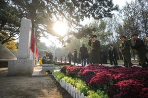 (251025) -- SHENYANG, 25 octubre, 2025 (Xinhua) -- Veteranos de los Voluntarios del Pueblo Chino (VPCh) presentan flores a los mártires de los VPCh en el cementerio de los mártires de los VPCh, en Shenyang, en la provincia de Liaoning, en el noreste de China, el 25 de octubre de 2025. La provincia de Liaoning realizó el sábado ceremonias de presentación de cestas de flores en Shenyang y Dandong para conmemorar el 75º aniversario del ingreso a la República Popular Democrática de Corea de los VPCh para luchar en la Guerra de Resistencia contra la Agresión de Estados Unidos y de Ayuda a Corea. (Xinhua/Pan Yulong) (jg) (da)