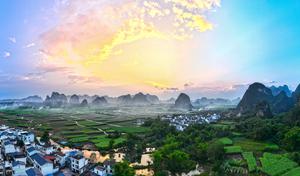 (251023) -- BEIJING, 23 octubre, 2025 (Xinhua) -- Vista aérea tomada con un dron del 19 de octubre de 2025 de la vista del atardecer sobre la aldea de Shanglong del distrito de Longzhou, en la región autónoma de la etnia zhuang de Guangxi, en el sur de China. (Xinhua/Yu Xiangquan) (da) (ra) (ce)