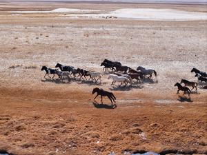 (251025) -- BEIJING, 25 octubre, 2025 (Xinhua) -- Vista aérea tomada con un dron el 23 de octubre de 2025 de caballos galopando en una pradera, en el distrito autónomo kazajo de Aksay, en la provincia de Gansu, en el noroeste de China. (Xinhua/Gao Hongshan) (oa) (da)