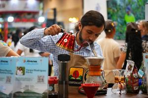 (251024) -- BOGOTA, 24 octubre, 2025 (Xinhua) -- Un hombre realiza una preparación de café durante la feria Cafés de Colombia Expo 2025 llevada a cabo en el recinto ferial Corferias, en Bogotá, capital de Colombia, el 24 de octubre de 2025. Los productores de cafés especiales de Colombia ven con interés el crecimiento del mercado en China que para 2025 se ha consolidado como el sexto comprador del producto insigne del país andino, según cifras de la Federación Nacional de Cafeteros, y se proyecta para ser uno de los primeros compradores en los próximos años. (Xinhua/Andrés Moreno) (am) (jg) (da) (ce)