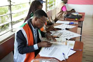 (251025) -- ABIYAN, 25 octubre, 2025 (Xinhua) -- Trabajadores revisan la información de los electores en un colegio electoral durante las elecciones presidenciales de 2025 de Cote d'Ivoire, en Abiyán, Cote d'Ivoire, el 25 de octubre de 2025. Los electores en Cote d'Ivoire comenzaron a emitir sus votos el sábado en las elecciones presidenciales de 2025. (Xinhua/Zhang Jian) (oa) (da)