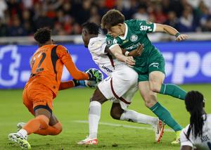 (251024) -- QUITO, 24 octubre, 2025 (Xinhua) -- Imagen del 23 de octubre del 2025 del guardameta, Alexander Domínguez (i), de Liga Deportiva Universitaria de Quito, de Ecuador, disputando el balón con Agustín Giay (d), de Palmeiras, de Brasil, durante el partido de ida correspondiente a la semifinal de la Copa Conmebol Libertadores, celebrado en el estadio Rodrigo Paz Delgado, en Quito, capital de Ecuador. (Xinhua/Ricardo Landeta) (rl) (rtg) (ra) (ce)