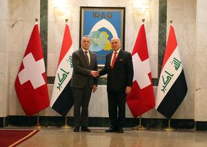 (251023) -- BAGDAD, 23 octubre, 2025 (Xinhua) -- El ministro de Relaciones Exteriores iraquí, Fuad Hussein (d), y el consejero federal y ministro de Asuntos Exteriores de Suiza, Ignazio Cassis (i), estrechan las manos, en Bagdad, Irak, el 23 de octubre de 2025. El primer ministro iraquí, Mohammed Shia' al-Sudani, se reunió el jueves con una delegación suiza de alto nivel para discutir la mejora de la cooperación bilateral y atraer inversiones suizas en los principales proyectos de desarrollo iraquíes, en particular la iniciativa de la Ruta del Desarrollo. (Xinhua/Khalil Dawood) (rtg) (ra) (ce)