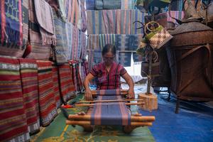 (251024) -- VIENTIAN, 24 octubre, 2025 (Xinhua) -- Imagen del 23 de octubre de 2025 de una artesana mostrando cómo operar un telar durante el 24.º Festival de Artesanía de Laos, en Vientián, Laos. Más de 130 estands de exposición han sido instalados, exhibiendo textiles, joyería, cerámica, tallas de madera, etc. (Xinhua/Kaikeo Saiyasane) (jg) (da) (ce)