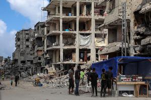 (251024) -- GAZA, 24 octubre, 2025 (Xinhua) -- Palestinos se reúnen en un puesto callejero bajo los edificios destruidos, en Jabalia, en el norte de la Franja de Gaza, el 24 de octubre de 2025. La Organización de las Naciones Unidas calcula que aproximadamente el 92 por ciento de todos los edificios habitacionales en Gaza, cerca de 436.000 viviendas, han sido dañados o destruidos desde que comenzó el conflicto. (Xinhua/Rizek Abdeljawad) (oa) (ra) (ce)