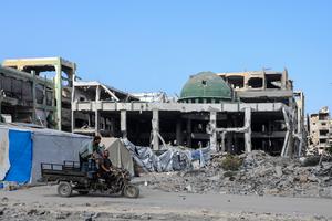 (251024) -- GAZA, 24 octubre, 2025 (Xinhua) -- Palestinos son vistos en una calle de edificios destruidos, en Jabalia, en el norte de la Franja de Gaza, el 24 de octubre de 2025. La Organización de las Naciones Unidas calcula que aproximadamente el 92 por ciento de todos los edificios habitacionales en Gaza, cerca de 436.000 viviendas, han sido dañados o destruidos desde que comenzó el conflicto. (Xinhua/Rizek Abdeljawad) (oa) (ra) (ce)