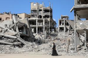(251024) -- GAZA, 24 octubre, 2025 (Xinhua) -- Una mujer palestina camina frente a edificios destruidos, en Jabalia, en el norte de la Franja de Gaza, el 24 de octubre de 2025. La Organización de las Naciones Unidas calcula que aproximadamente el 92 por ciento de todos los edificios habitacionales en Gaza, cerca de 436.000 viviendas, han sido dañados o destruidos desde que comenzó el conflicto. (Xinhua/Rizek Abdeljawad) (oa) (ra) (ce)