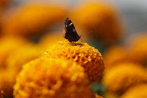 (251023) -- CIUDAD DE MEXICO, 23 octubre, 2025 (Xinhua) -- Imagen del 21 de octubre de 2025 de una mariposa posándose sobre una flor de cempasúchil, un elemento tradicional de las ofrendas de Día de Muertos, en la Ciudad de México, capital de México. La flor de cempasúchil tiene un profundo significado espiritual en México, además de aportar color y aroma a los altares tradicionales en honor a los difuntos, así como generar sustento para cientos de familias campesinas que mantienen viva la tradición del Día de Muertos, el 1 y el 2 de noviembre. (Xinhua/Francisco Cañedo) (fc) (rtg) (ra) (ce)