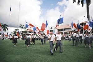 (251023) -- CIUDAD DE PANAMA, 23 octubre, 2025 (Xinhua) -- Estudiantes sostienen banderas durante la ceremonia de la "Siembra de Banderas", en la Ciudad de Panamá, capital de Panamá, el 23 de octubre de 2025. Los panameños realizaron el jueves la tradicional e histórica "Siembra de Banderas", un evento anual celebrado en la Ciudad del Saber, en recuerdo de la gesta patriótica del 2 de mayo de 1958, cuando un grupo de estudiantes colocó 65 banderas panameñas en puntos emblemáticos de la desaparecida Zona del Canal, entonces bajo control de Estados Unidos. (Xinhua/Xu Yongzheng) (rtg) (ra) (ce)