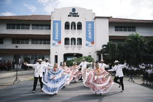 (251023) — CIUDAD DE PANAMA, 23 octubre, 2025 (Xinhua) — Artistas realizan una presentación previo al inicio de la ceremonia de la “Siembra de Banderas”, en la Ciudad de Panamá, capital de Panamá, el 23 de octubre de 2025. Los panameños realizaron el jueves la tradicional e histórica “Siembra de Banderas”, un evento anual celebrado en la Ciudad del Saber, en recuerdo de la gesta patriótica del 2 de mayo de 1958, cuando un grupo de estudiantes colocó 65 banderas panameñas en puntos emblemáticos de la desaparecida Zona del Canal, entonces bajo control de Estados Unidos. (Xinhua/Xu Yongzheng) (rtg) (ra) (ce)