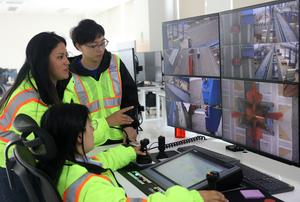 (251025) — CHANCAY, 25 octubre, 2025 (Xinhua) — Imagen del 7 de octubre de 2025 de Astrid Lozano (c), bilingüe chino-español y analista de estadísticas y reportes, trabajando en las oficinas del puerto de Chancay, en Chancay, Perú. (Xinhua/Mariana Bazo) (mb) (oa) (da)