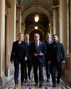 (251025) -- LONDRES, 25 octubre, 2025 (Xinhua) -- Imagen del 24 de octubre de 2025 del primer ministro británico, Keir Starmer (c-frente), el presidente ucraniano, Volodymyr Zelensky (d-frente), la primera ministra danesa, Mette Frederiksen (i-frente), el secretario general de la Organización del Tratado del Atlántico Norte (OTAN), Mark Rutte (d-atrás), y el primer ministro neerlandés, Dick Schoof, vistos previo a una reunión de la "Coalición de los Voluntarios", en Londres, Reino Unido. Los líderes europeos y el jefe de la OTAN se comprometieron el viernes a intensificar las sanciones contra Rusia y acelerar la entrega de armas de ataque de largo alcance y defensa aérea a Ucrania, tras una reunión de la "Coalición de los Voluntarios" celebrada en Londres. (Xinhua/Simon Dawson/Número 10 de Downing Street) (jg) (da) ***SOLO USO EDITORIAL***