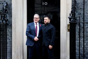 (251024) -- LONDRES, 24 octubre, 2025 (Xinhua) -- El primer ministro británico, Keir Starmer (i), estrecha la mano del visitante presidente ucraniano, Volodymyr Zelensky, en el número 10 de Downing Street, en Londres, Reino Unido, el 24 de octubre de 2025. (Xinhua/Li Ying) (rtg) (ra) (ce)