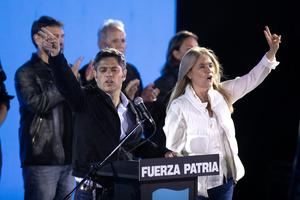 (251027) — LA PLATA, 27 octubre, 2025 (Xinhua) — Imagen del 26 de octubre de 2025 del gobernador de la provincia de Buenos Aires, Axel Kicillof (i), reaccionando en el búnker de campaña del partido Fuerza Patria al término de las elecciones legislativas de medio término, en la ciudad de La Plata, Argentina. El presidente de Argentina, Javier Milei, celebró el domingo el triunfo de su partido, La Libertad Avanza, en las elecciones legislativas de medio término, y prometió el desarrollo de un “camino reformista para consolidar el crecimiento y el despegue definitivo” del país sudamericano. (Xinhua/Martín Zabala) (mz) (oa) (ah) (ce)