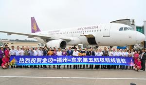 (251026) -- FUZHOU, 26 octubre, 2025 (Xinhua) -- Una ceremonia para marcar el lanzamiento del primer vuelo de Fujian que obtuvo la Quinta Libertad del Aire se lleva a cabo en el Aeropuerto Internacional Changle de Fuzhou, en Fuzhou, en la provincia de Fujian, en el sureste de China, el 26 de octubre de 2025. El primer vuelo de Fujian que obtuvo la Quinta Libertad del Aire, la ruta "Phnom Penh-Fuzhou-Tokio", fue oficialmente lanzada el domingo. La Quinta Libertad del Aire se refiere al derecho otorgado a una aerolínea de un país de hacer escala en un tercer país mientras opera una ruta internacional, lo que le permite cargar y descargar allí pasajeros y carga. (Xinhua/Lin Shanchuan) (rtg) (ah)